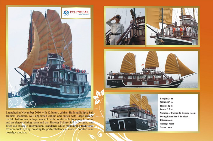 Du thuyền Eclipse Sail Hạ Long (dài 38m, rộng 8,5m) đạt tiêu chuẩn 4 sao.. Toàn bộ tàu được chia làm 2 tầng gồm có 12 phòng ngủ với công trình phụ khép kín, diện tích mỗi phòng là 16m2, ...